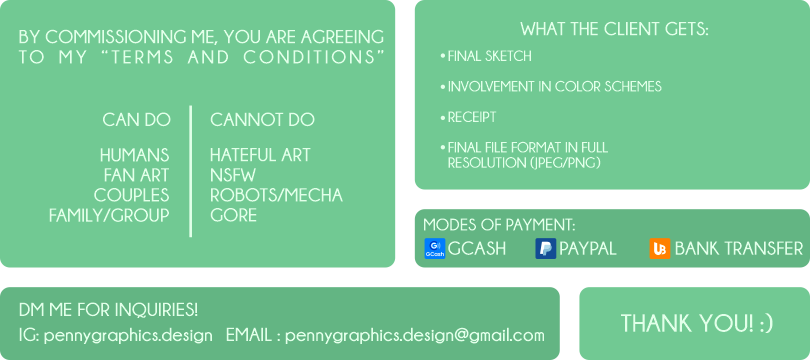 or Bank Transfer.‣ Commissioned artwork can be paid either 100%